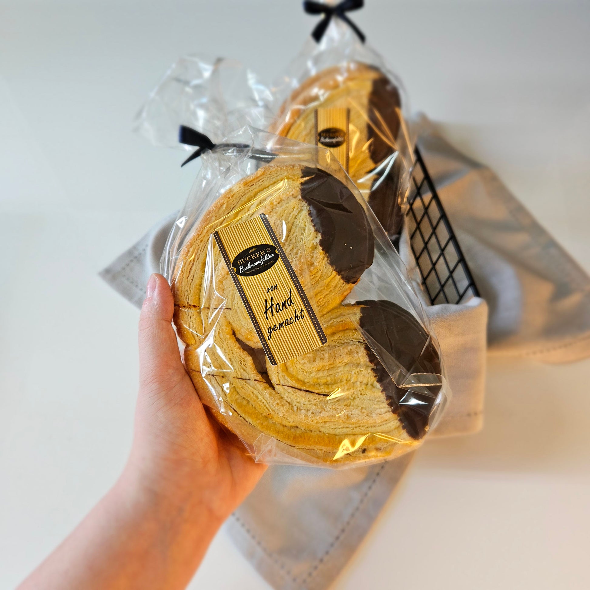 Unsere Schweineöhrchen sind ein klassisches Blätterteiggebäck mit feiner Butternote und einem Hauch Karamell. Der locker geschichtete Blätterteig wird goldbraun gebacken und anschließend mit edler Zartbitterschokolade (60 %) verfeinert. So entsteht ein harmonischer Genuss aus knuspriger Textur, dezenter Süße und einer angenehm herben Schokoladennote.
